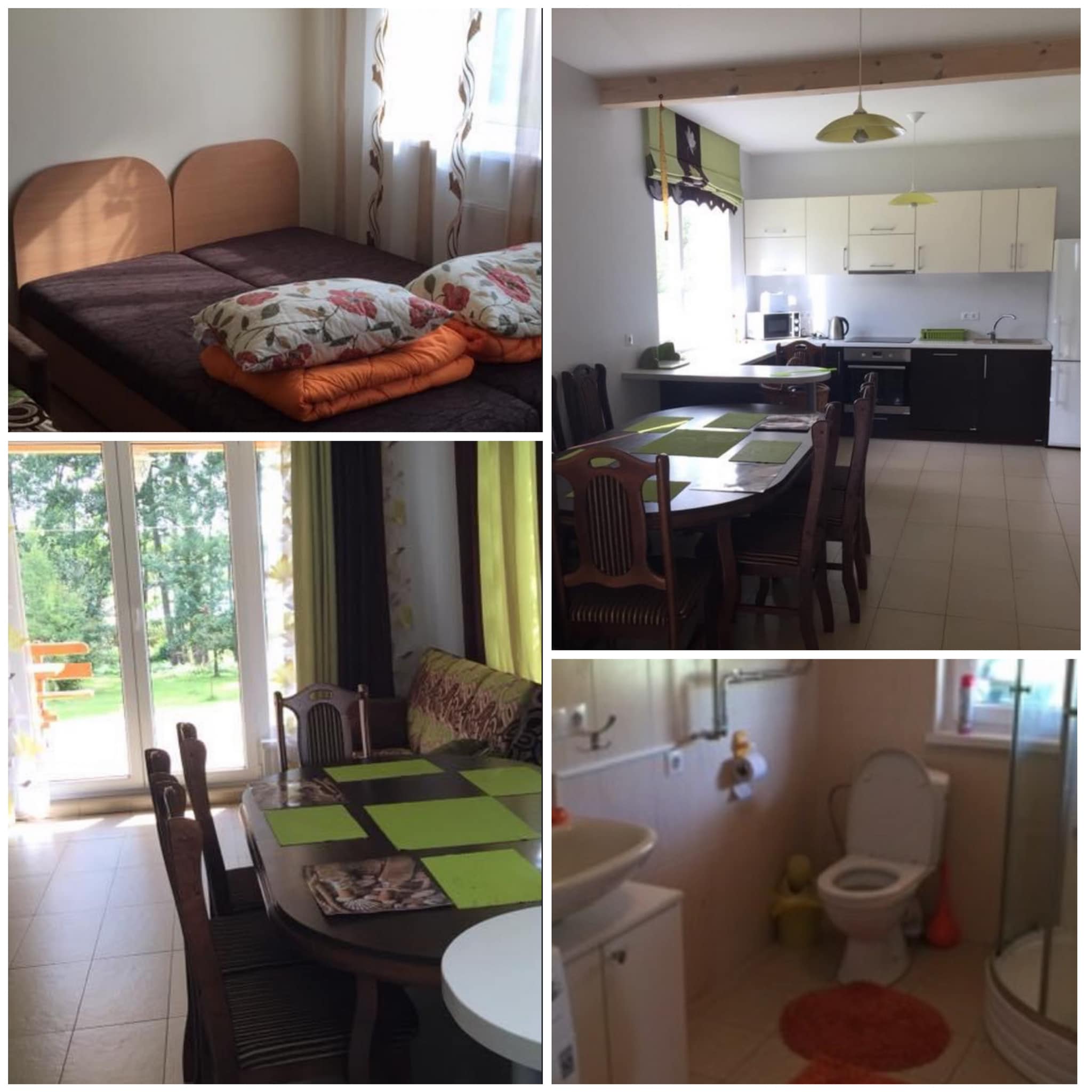 3 kambariai, erdvus salionas,2 miegamieji:trivietis ir keturvietis ,O salione-nišoje įrengtas,kaip trečias miegamasis su patogia dvigule sofa-lova).